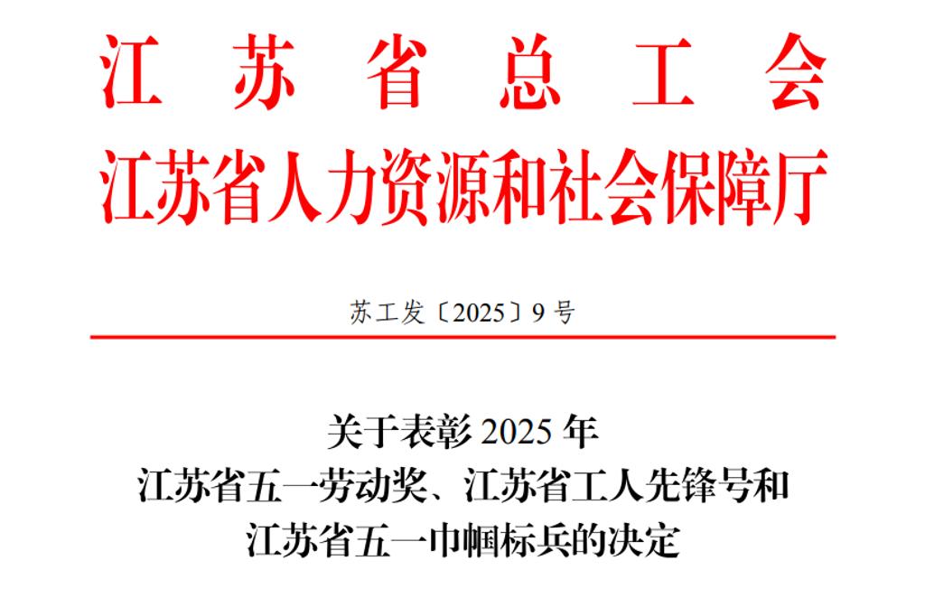 近日,江苏省总工会、江苏省人力资源和社会保障厅联合发文,公布了《关于表彰2025年江苏省五一劳动奖、江苏省工人先锋号和江苏省五一巾帼标兵的决定》,抖阴