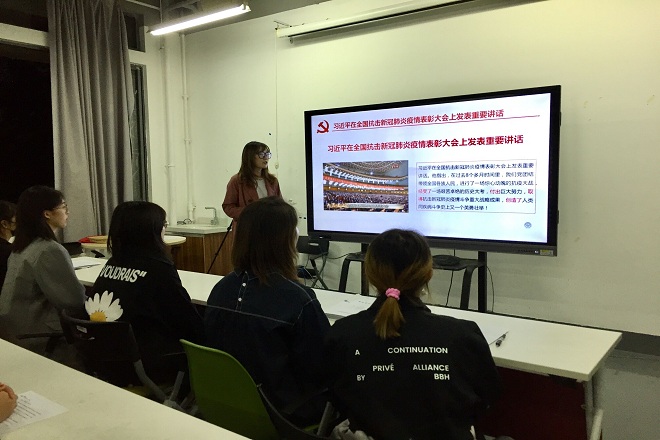 本科服装党支部举行主题党日活动,专题学习习近平总书记在全国抗击新冠肺炎疫情表彰大会上的重要讲话。活动由党支部书记于乐主持,全体党员参加学习。