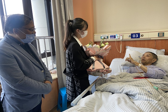 探望过程中,服装专业金倩同学代表全院学生向许恩源教授献花,并表达了将以许恩源教授等抖阴