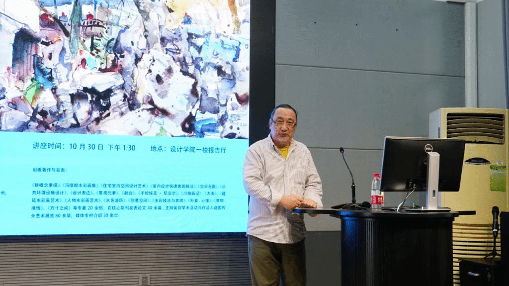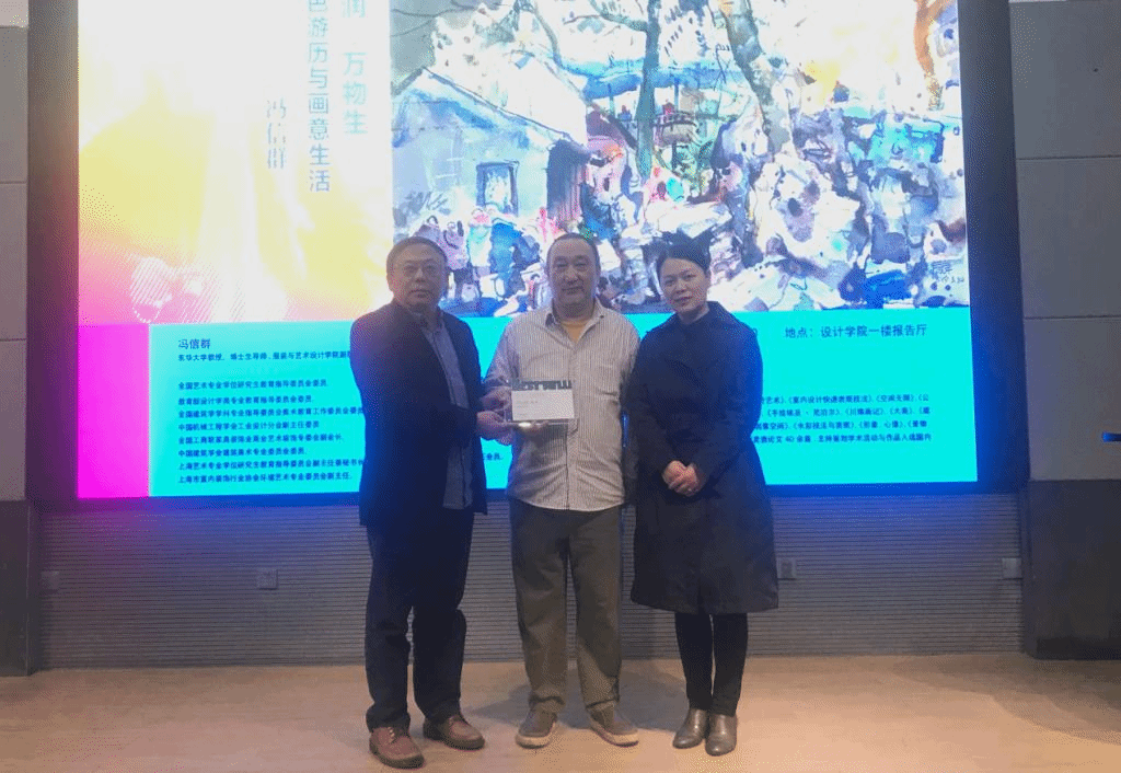 此次讲座主题为“水润·万物生——水色游历与画意生活”,冯信群教授将自己称作“热爱水彩的教育工作者”,用“水润万物”的方式记录自己对生活情趣的追求。讲座中,冯教授分享了他十年来在水彩风景画主题创作中的实践探索与思考,通过展示大量自己外出游历时的水彩写生作品,讲述每一副绚丽动人的画作背后的故事,向听众传达心灵的感受和对景物的探索。在这些画作中,有西域风情,有原味乡村,也有异国风貌,冯教授建议学生们要在写生过程中用发现的眼光去寻找,看见不等同于发现,发现是因为想看见。要用朴素真诚的语言表现原汁原味的风土,体会中国美,感受民族文化内涵之美,在写生游历的过程中感悟万物,在路途中发现自己,寻求艺术的精神家园与归宿。“致广大而精微”,是讲座最后冯教授同大家分享的他的座右铭,力求在画作的方寸之间阐释乾坤万物。