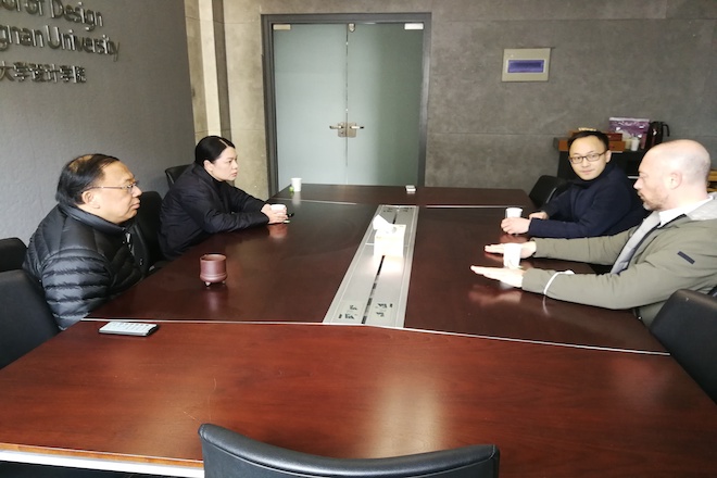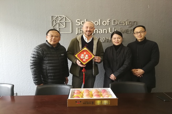 2月8日上午,院党委书记邱建平、院长魏洁与工业设计系主任梁峭、专职组织员陈祥洁同院全职意大利外教Gabriele Goretti进行座谈,对其首次在锡过年表示慰问,并送上新春祝福!