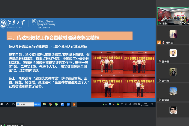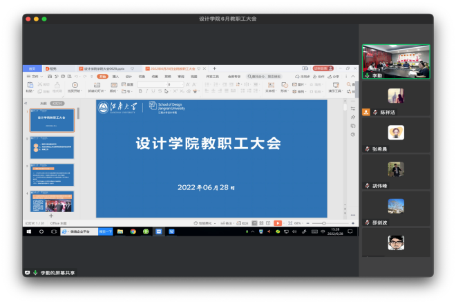 科研项目申报情况,重点介绍了国家社科基金、国家艺术基金项目方面取得的突破进展;潘春宇副院长介绍了国际交流工作取得的进展情况并分享了下一步工作思路;曹鸣副院长介绍了本科教学工作情况,介绍了优秀毕业设计在线展览的情况,并重点就“设计青山”前瞻计划进行了介绍;廖曦副院长介绍了研究生招生录取和毕业工作情况,通报了研究生暑期工作营、实验室安全等工作情况。