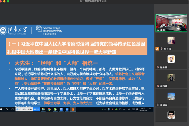 按照教职工政治理论学习和师德教育要求,邱建平书记首先领学了《习近平在中国人民大学考察时讲话》《习近平总书记在庆祝中国共产主义青年团成立100 周年大会讲话》《习近平给南京大学留学归国青年学者的回信》和《新时代的中国青年》白皮书等内容,要求抖阴