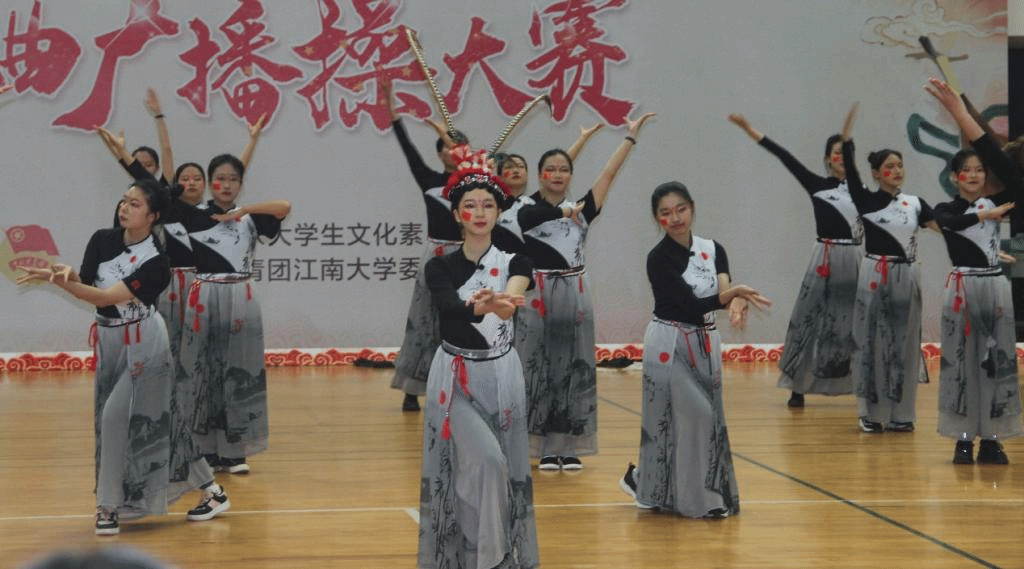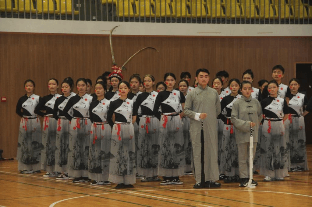候场之时,同学们神态各异,默默紧张又隐含期待。响鼓锤戏腔起,音乐扬,舞步上,水墨裾一荡,墨色少年齐登场。领舞扬素手起长袖翩翩,脚步划一;曲中玄衣舞银枪,一个空翻一个腾跃,惹全场赞叹;紧接着,开绸扇,水墨扇面舞动;至尾声,无人机带横幅腾空而起——“强国有我”“设计强国”亮相收官。