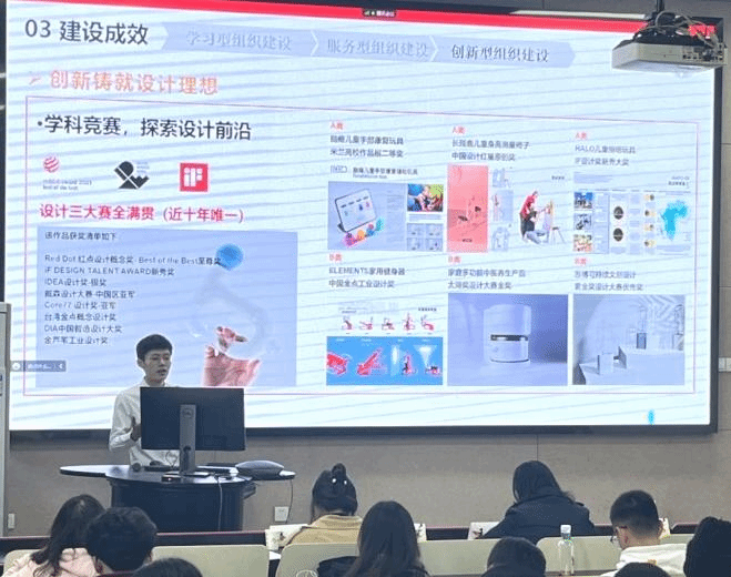 交互设计党支部作为“全国百个研究生样板党支部”介绍支部特色工作。支部组织委员赵振皓以“乘着时代的风云,以微毫诠释盛大”为题展示了支部的基本情况、建设思路和建设成效。他表示支部围绕学习型、服务型、创新型基层党组织建设,一直追求“把党支部建在专业一线”,通过“党建+专业”互融共建、同频共振,有效实现了“党建带专业,专业促党建”的耦合交融和协同发展。最后,他鼓励各支部要将学科特长融入党建之中,以创新助力设计理想,助力大国重器,弘扬设计青年之声。