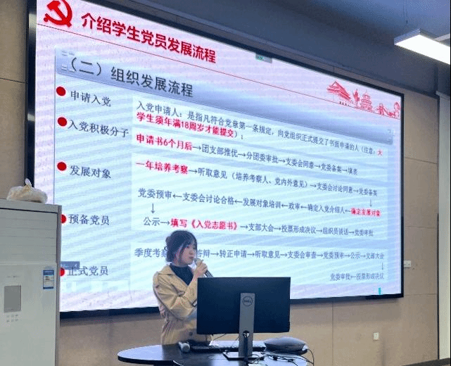学生党员发展的流程。她以发展时间节点为主线认真讲解了申请入党、入党积极分子、发展对象、预备党员和正式党员等五个部分的流程和要点,重点强调了党支部在各个环节中的作用以及需要承担的工作内容,各部分材料的书写规范以及需要注意的问题,并详细介绍了江苏省大学生党员发展工作“三投票三公示一答辩”的实施办法,希望各支部在党员发展的各个环节中能够严格遵守“十六字”总要求和各项规章制度,做到公平公正公开,提高发展工作科学性和公信度,把真正优秀的积极分子吸纳到党组织中来。