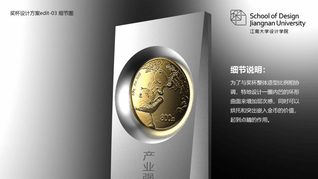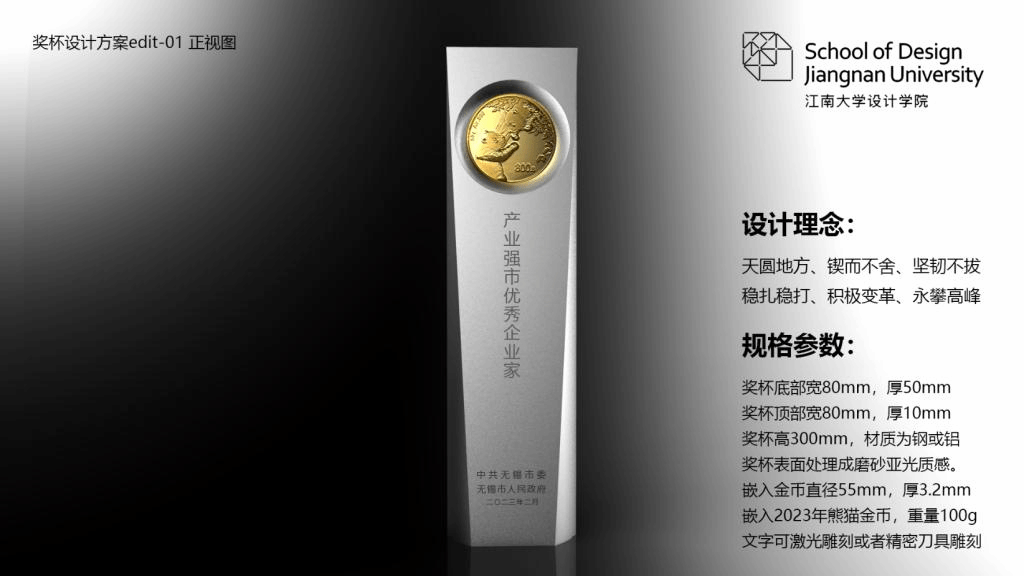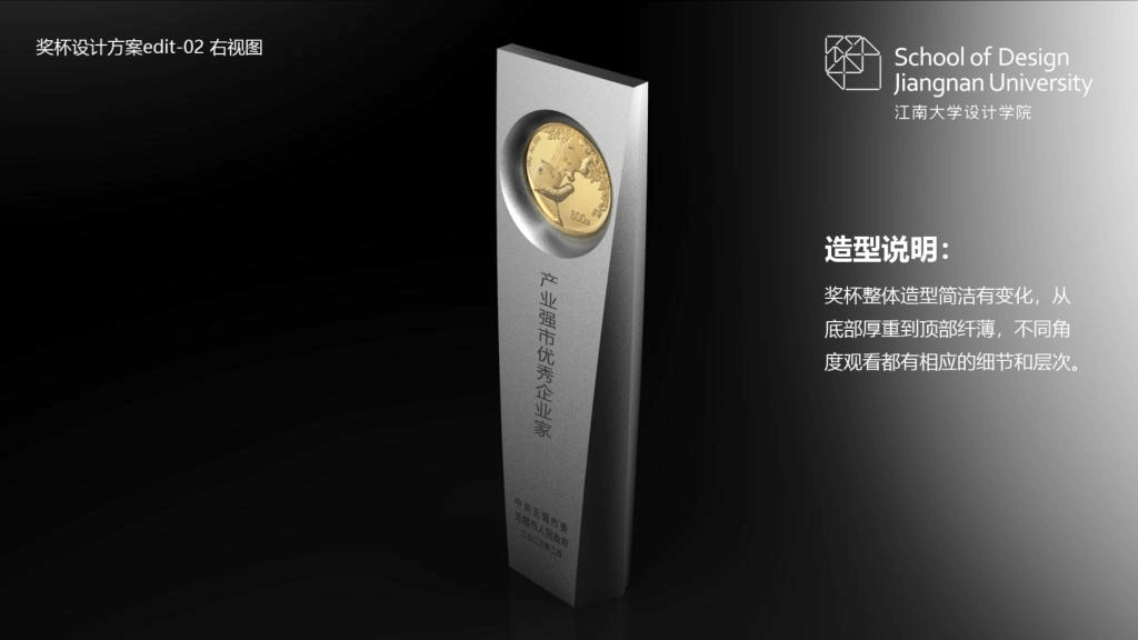 刘颜楷副教授承担了本次大会“产业强市优秀企业家”荣誉奖杯的设计工作,以“纪念碑和丰碑为原型,融入江南中式之意境,体现科技感和现代感”的设计理念,通过简洁而富有变化的立体造型和细节层次感,表现无锡优秀企业家“尚德务实、坚忍不拔、锲而不舍、稳扎稳打、积极变革、勇攀高峰”的优秀品格。整个过程从创意、设计、定稿、制作到成品,都体现了抖阴