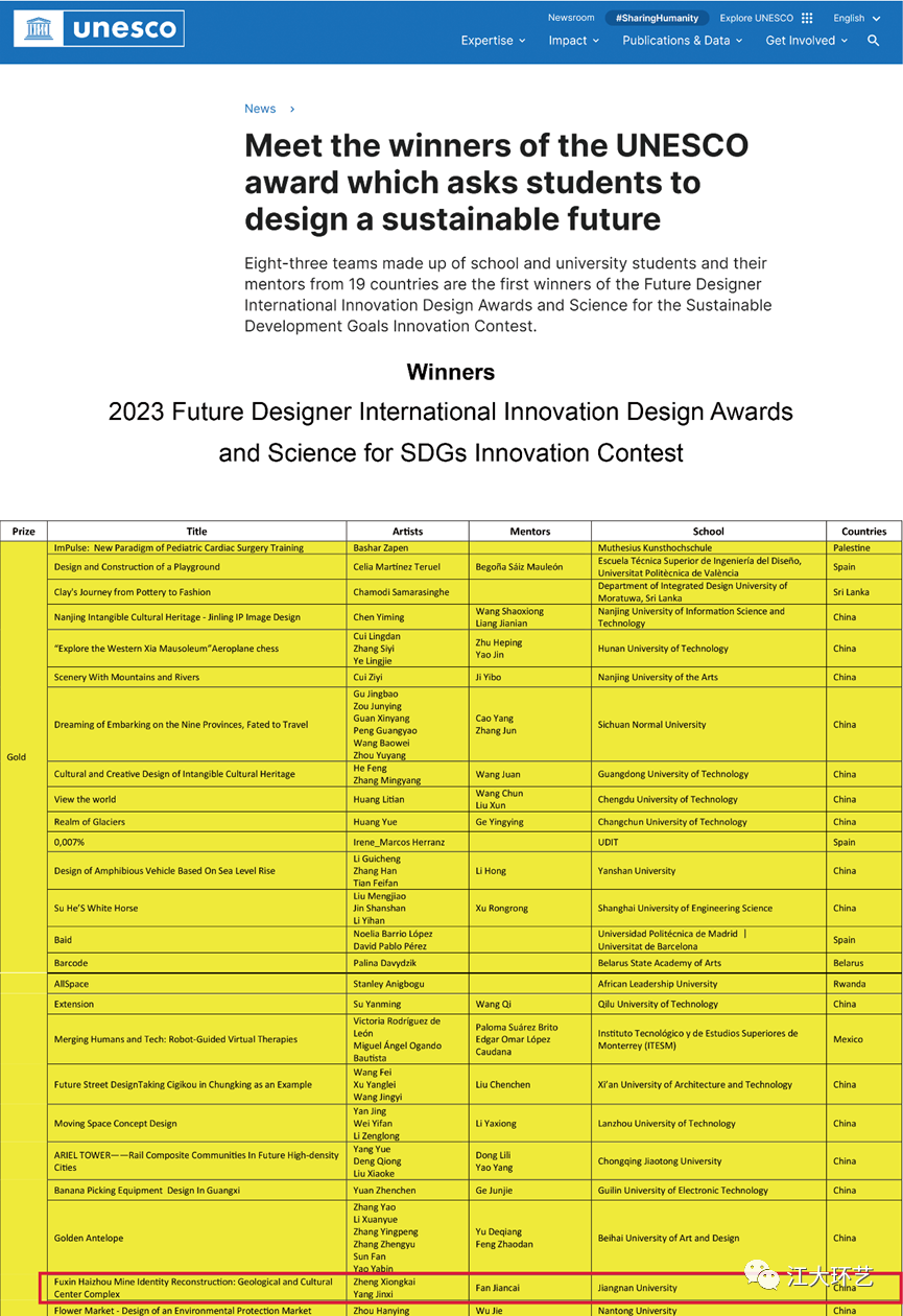 环境设计系研究生郑雄凯、 杨金曦(Zheng Xiongkai, Yang Jinxi)的作品《Fuxin Haizhou Mine Identity Reconstruction: Geological and Cultural Center Complex》获得了金奖。未来设计师·国际创新设计大赛暨科技赋能可持续发展大赛(International Innovation Design Awards, IIDA & Science for SDGs Innovation Contest)由联合国教科文组织与IIDA组委会主办,向世界各地的年轻人征集创新和创意作品,促进和倡导科学、工程和STEM在可持续发展目标中的重要作用,帮助青年人拓展国际视野,助推可持续发展。竞赛收到了来自48个国家和地区近1500个队伍参赛作品。未来设计师NCDA大赛是中国唯一的选拔赛,获得2023第11届未来设计师NCDA大赛国赛一、二等奖的作品有资格参赛。经过初选,共228件作品进入最终决赛,产生了83个奖项。赛事评委来自艺术、设计、科学,工程领域的专家,有联合国官员,大学教授和行业人员。