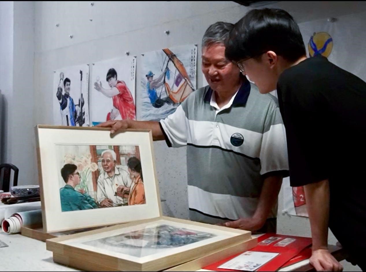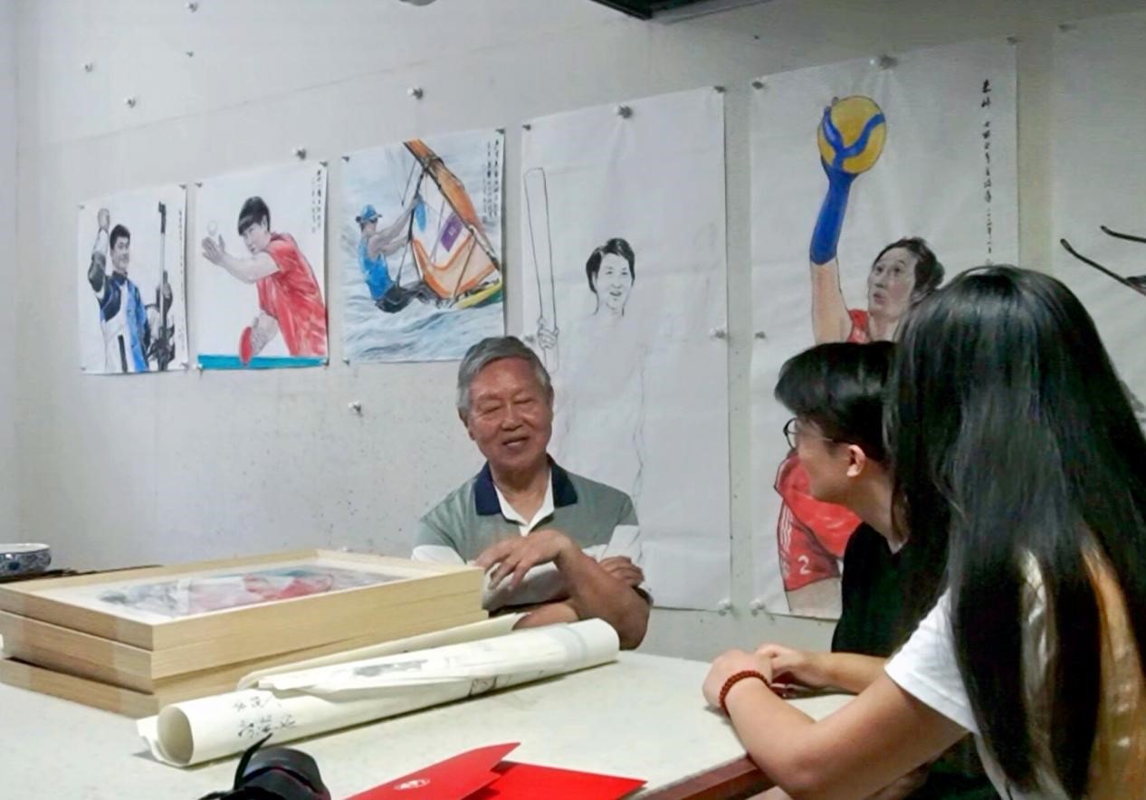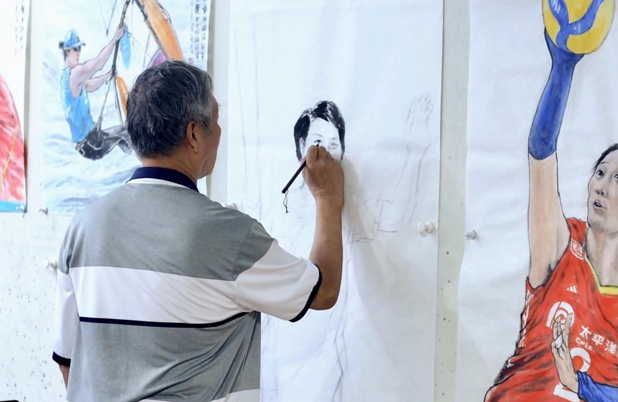 实践团队到达时刘观庆教授正专心致志为迎接巴黎奥运会的到来绘制无锡奥运名人顾俊的画像,谈及奥运群英谱作品展,刘教授的眼神中闪烁着对体育精神的崇敬与对运动员们拼搏精神的赞美。他介绍,此次展览旨在通过艺术作品的形式,向世界展示中国奥运健儿的英勇身姿和顽强拼搏的精神风貌。刘教授认为,每一位奥运选手的背后,都承载着无数汗水与泪水,他们的故事是激励人心、催人奋进的最佳素材。因此,在创作中,他注重捕捉运动员们比赛瞬间的动态美,以及他们背后不为人知的坚韧与坚持,力求通过作品传达出“更高、更快、更强、更团结”的奥林匹克精神,激发公众的爱国情怀和民族自豪感。在刘观庆教授绘制的“奥运群英谱”中,每一笔、每一线都蕴含着他浓浓的爱国之情。这些作品不仅是对奥运精神的颂扬,更是对祖国繁荣昌盛的深情表达。