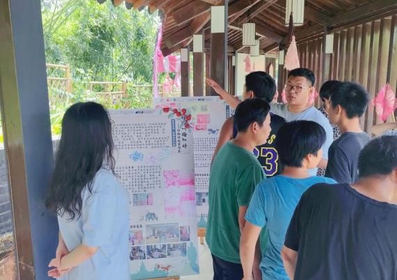 8月14日上午,烈日当空,“相约‘梅’好”实践团成员们顶着34℃的高温天气在古竹诗廊中布置展览,利用诗廊得天独厚的蜿蜒设计将展板错落摆放,与当地特产、扎染作品、与文创周边实物相得益彰。粉色的扎染布料悬挂在鱼鳞般的瓦片下,阳光透过长廊外的竹子缝隙中洒下,照在美丽的扎染布料上,微风拂过,竹影若隐若现,为整座长廊增添了一份别样的意境。下午,“杨梅古韵”展览正式开始,展览分为“古竹时光”“杨‘梅’吐气”“扎染生花”“文创周边”四个主题。一走进长廊,好似穿越到了一个由古竹文化与艺术创意编织的梦幻世界,每一块展板都是一处充满奇思妙想的空间,有无数美妙的惊喜等待发现。这一创意长廊也吸引了很多居民和小孩子,实践团成员们生动形象地讲解了古竹的历史、杨梅文化与扎染艺术的力量,分享了扎染过程中的趣事,其中,以天然竹林为背景的杨梅打卡区吸引了大家的驻足拍照。“哇,真的好美呀”、“今天真的学到了不少知识”“谢谢抖阴