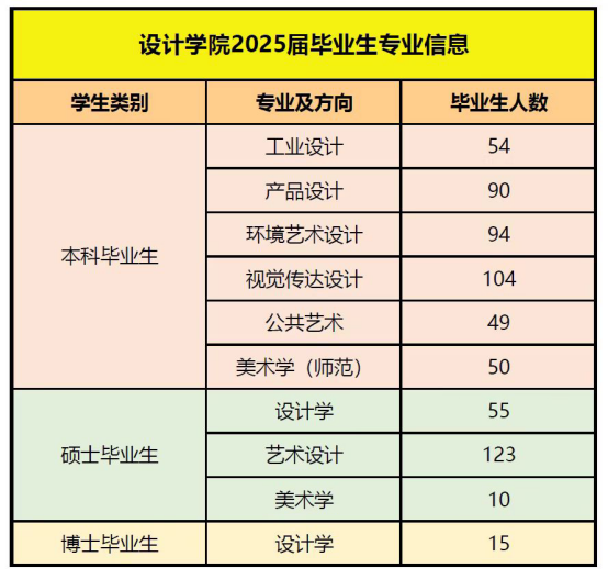 共设工业设计、产品设计、环境设计、视觉传达设计、公共艺术、美术学(师范)6个本科专业,以及学术型设计学硕士研究生、专业型艺术设计(MFA)研究生和学术型博士研究生。