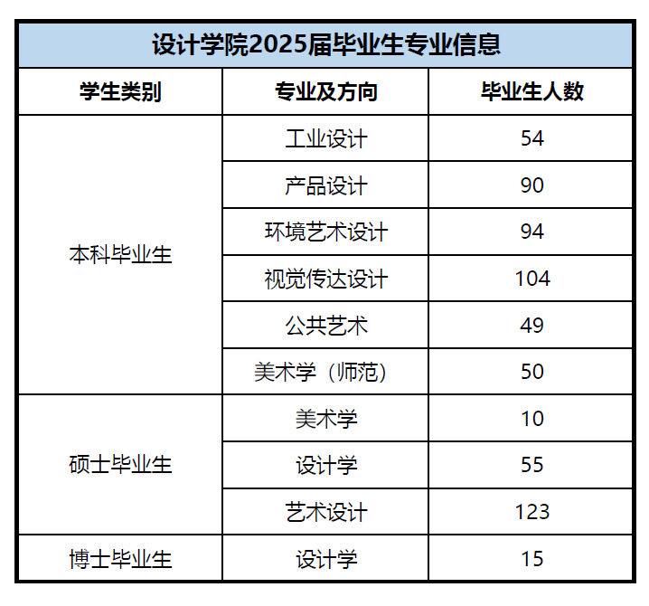 具有完备的本硕博一体化设计人才培养体系,目前设有设计学博士后流动站、“设计学”一级博士点、“设计”专业博士学位点(已公示),设有“设计学”和“美术学”一级学科学术型硕士点,以及“设计”专业学位硕士点。本科设有工业设计、产品设计、环境设计、视觉传达设计、公共艺术、美术学等共6个专业和一个“设计青山”前瞻计划实验班,设计类国家一流专业建设点全覆盖。