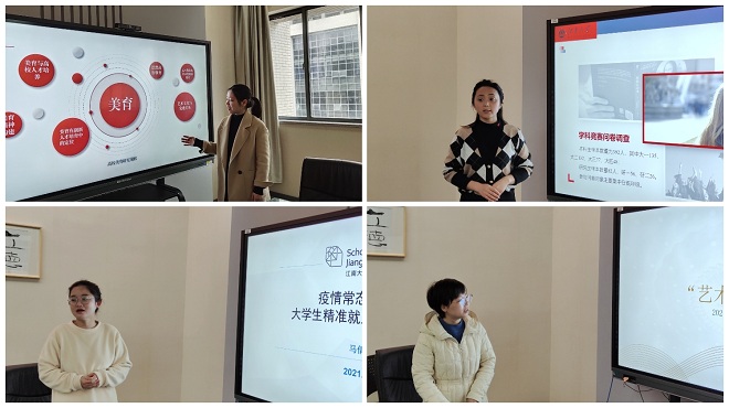 党建工作与竞赛融合的方式,提出以推进党支部书记“双带头人”工程为抓手助推学科竞赛工作;树立榜样,发挥学生党员先锋模范作用;开展“建党100周年”党建主题学科竞赛等措施。郑倩倩以设计学科特色与党建的交融为主题,阐述“艺术+党建”专业特色的“浸润式”党建育人新模式,她认为,围绕思想政治教育、专业特色、人才培养抓党建,充分利用艺术教育资源和优势,高校育人应深入考虑艺术类学生特点,以美育促德育,以艺术化人心,努力把思想政治教育的“盐”融入到思政课堂、校园文化、社会实践等大舞台的“汤”里。马倩如围绕“疫情常态背景下大学生精准就业帮扶策略研究”,分析了疫情背景下就业现状,深入剖析“慢就业”的原因,最后提出解决思路。