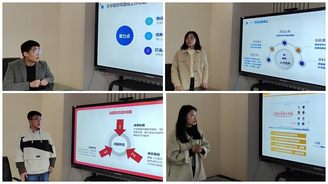 文体工作高质量发展”为题进行探讨,从当前问题——解决思路——未来举措三个板块精细剖析。王唯围绕“大学生社会实践与志愿服务”进行思考,她从党建带团学视角指出,以”党建+”为载体构建实践育人体系、以“党建+”为载体助推服务育人的时效性。