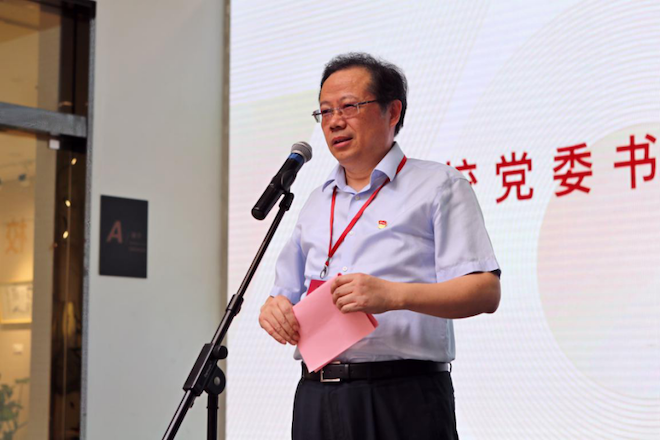 副院长魏洁、教师代表视传系党支部书记代福平与朱庆葆书记一起为展览揭幕。